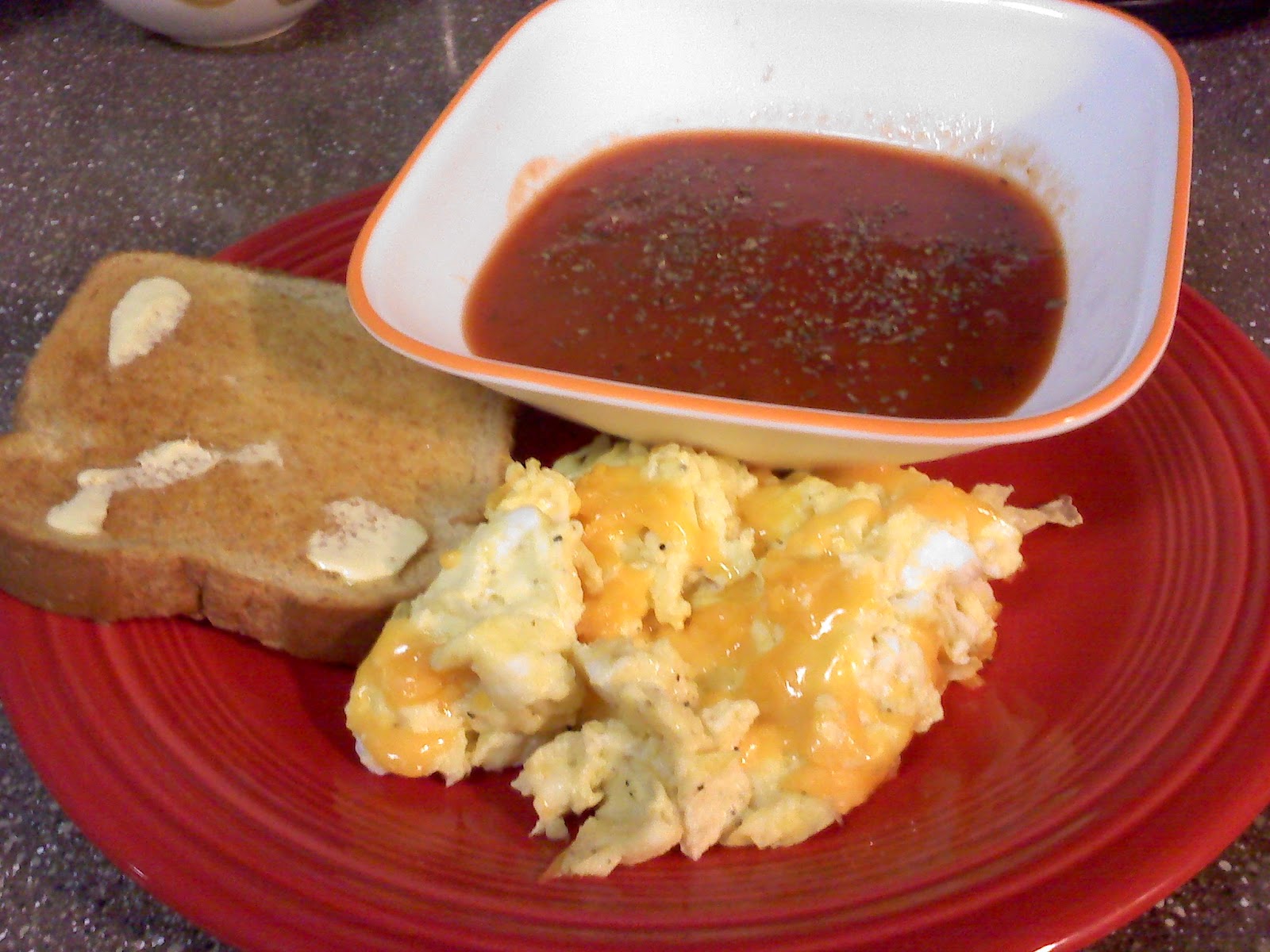 This was my dinner a few nights ago. Cheesy eggs, tomato soup and butter toast-I know I am totally lame. I think my body just needed protein.